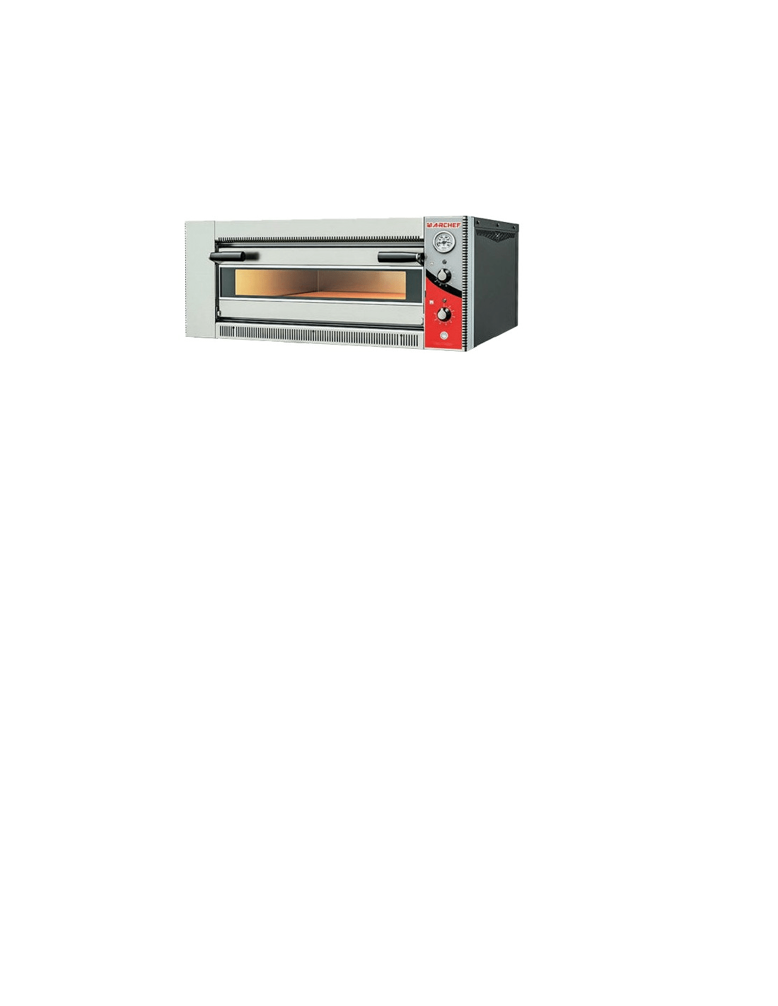 Horno simple de pizza eléctrico con soporte . Sistema de termostato regulable (85ºC /400ºC). Superficie de cocción base de piedra. Sistema de cubierta de espejo grande con mecanismo pesado. Sistema de aislamiento, mínima pérdida de calor. Lampara de iluminación para cada piso. Indicador de calor manual para suelo. Tiene capacidad para 4 pizzas. 240 V. Potencia 4 KW. Su peso es de 45KG. Dimensiones internas: 510 x 510 x 100 mm. Dimensiones externas: 850 X 730 X 360 MM