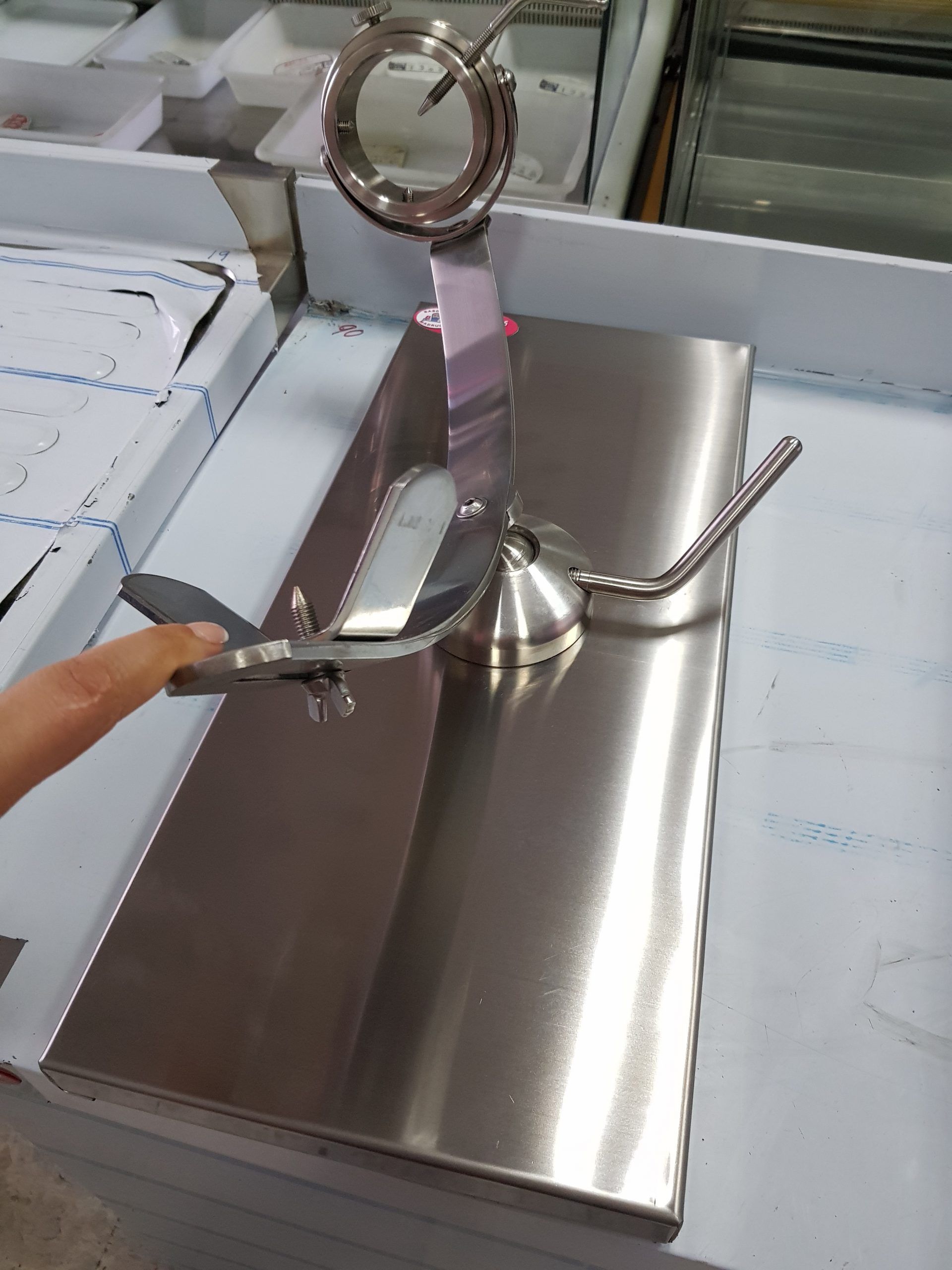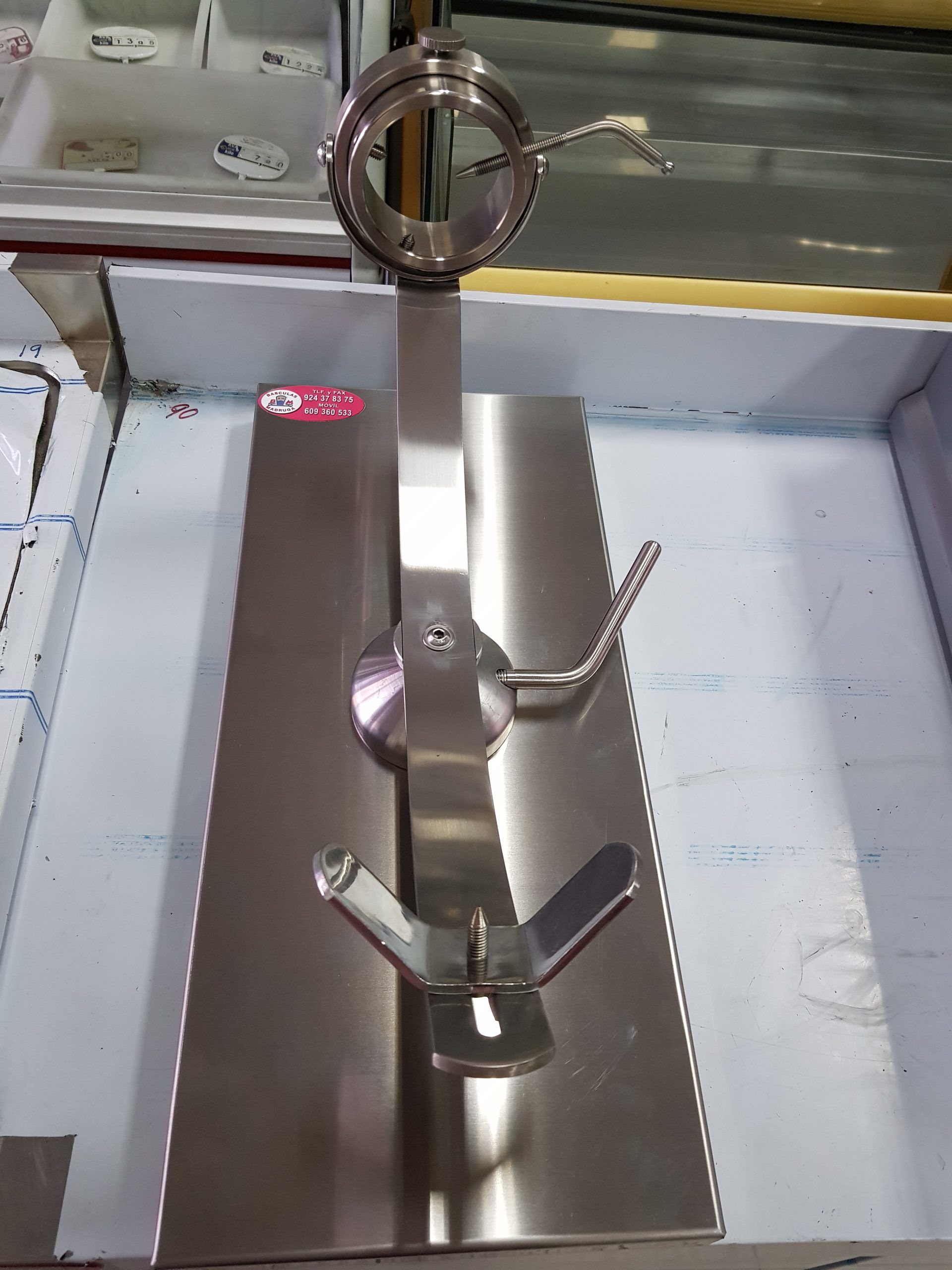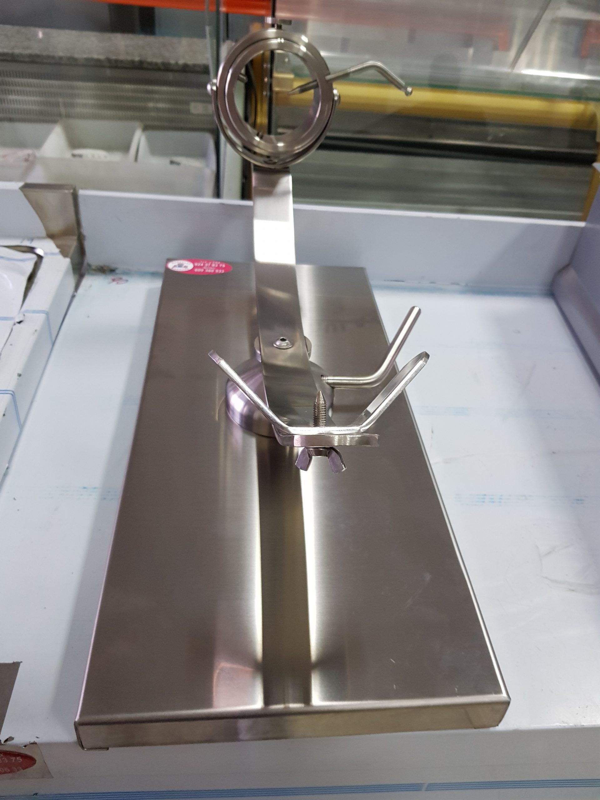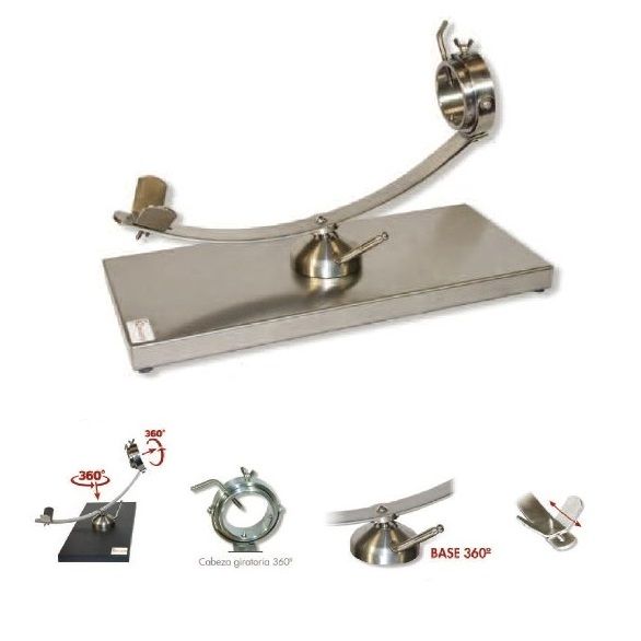 Jamonero rotatorio y giratorio. Base Inox. Jamonero rotatorio y giratorio 360º de acero inoxidable, base también de acero inoxidable. Jamonero con forma y diseño que facilita el corte del jamón. Puede moverse en balanza gracias a su pieza central de apoyo. Además permite un movimiento angular lateral y rotatorio respecto a la base. Nueva cabeza giratorio con mayor diámetro y con ajuste mejorado.