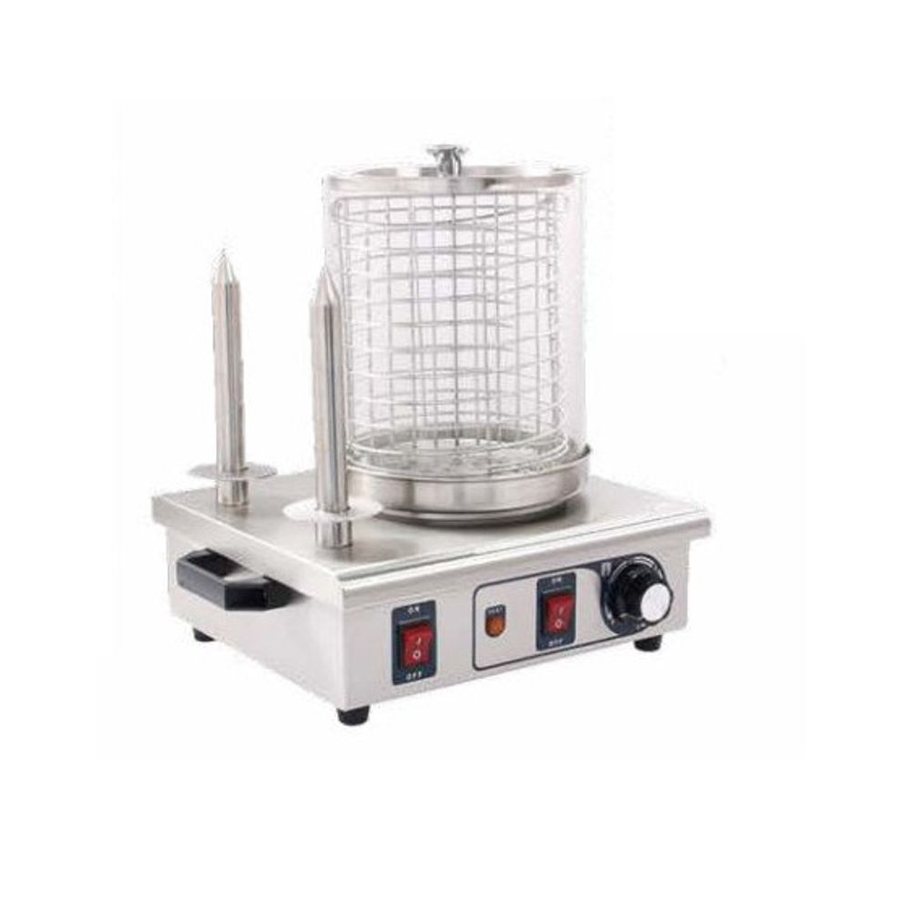 Maquina de perritos calientes 2 Pinchos HHD-2 de Acero Inoxidable con 2 barras para tostar el pan, Cilindro de cristal 200 x 240mmm, Regulador de temperatura 40 a 100ºC, Interruptor de encendido y Piloto indicador de funcionamiento.